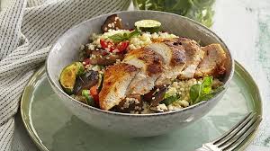 se zeleninou, kuřecím masem, rukolou a cherry rajčaty ( )