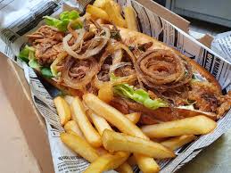s trhaným vepřovým masem, karamelizovanou cibulkou, BBQ omáčkou a okurkovým relishem, hranolky