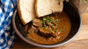 balený ve slanině, silná masová šťáva, šťouchaný brambor, zelný salát s křenem