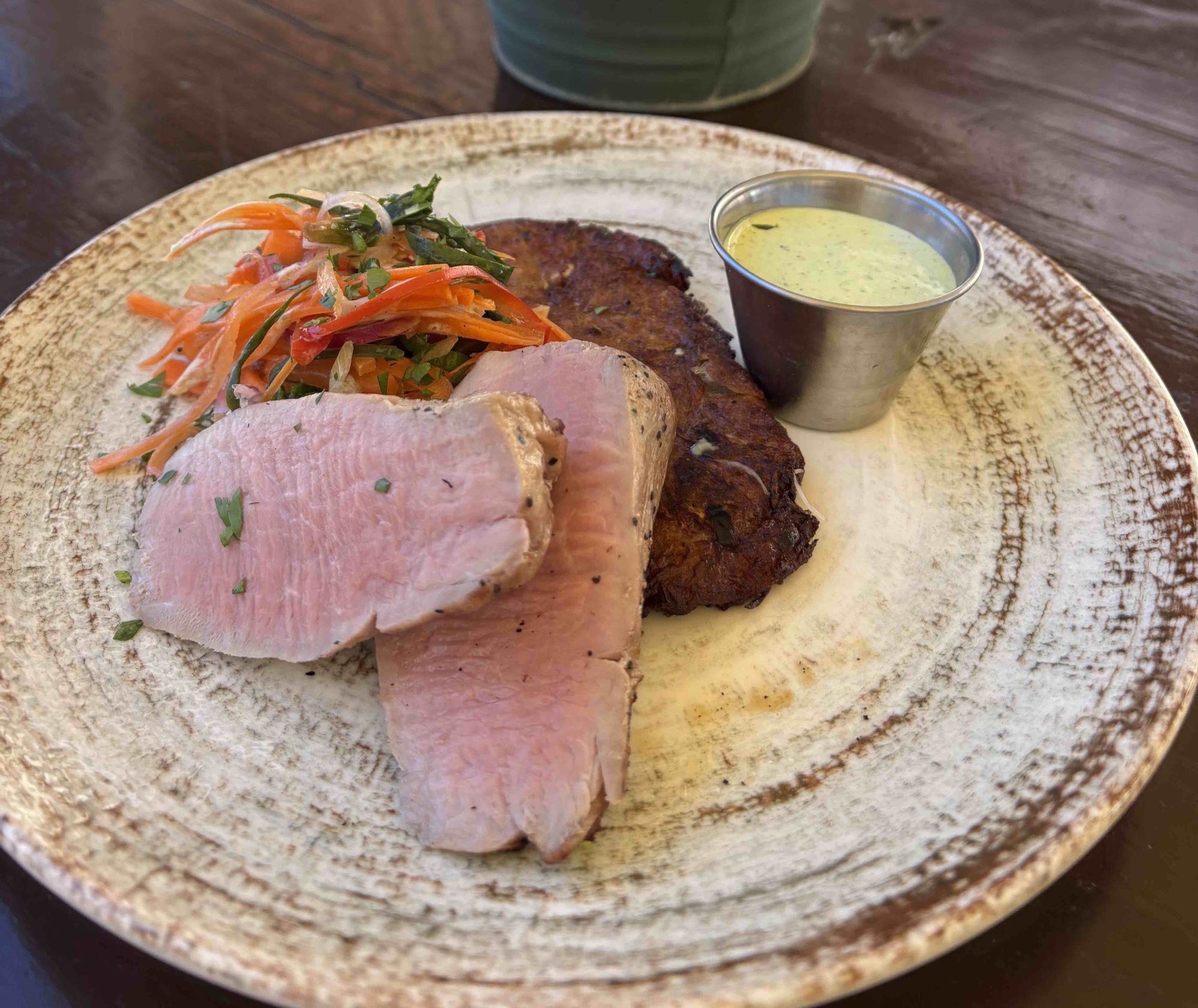 v kukuřičné strouhance, bramborová kaše, citron, rajčatový salátek ( , , , )