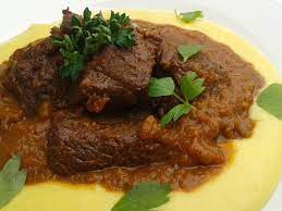 se silnou vinnou omáčkou s višněmi, šťouchané brambory a restovanou anglickou slaninou